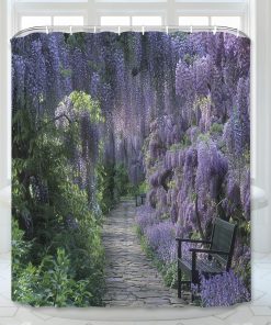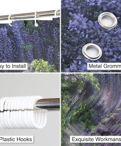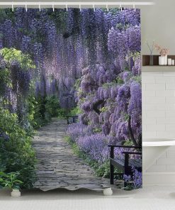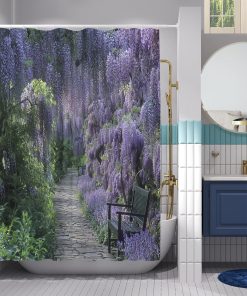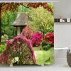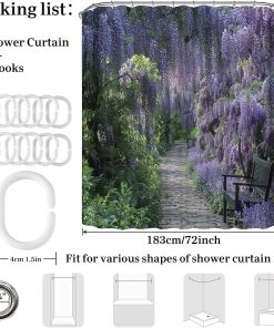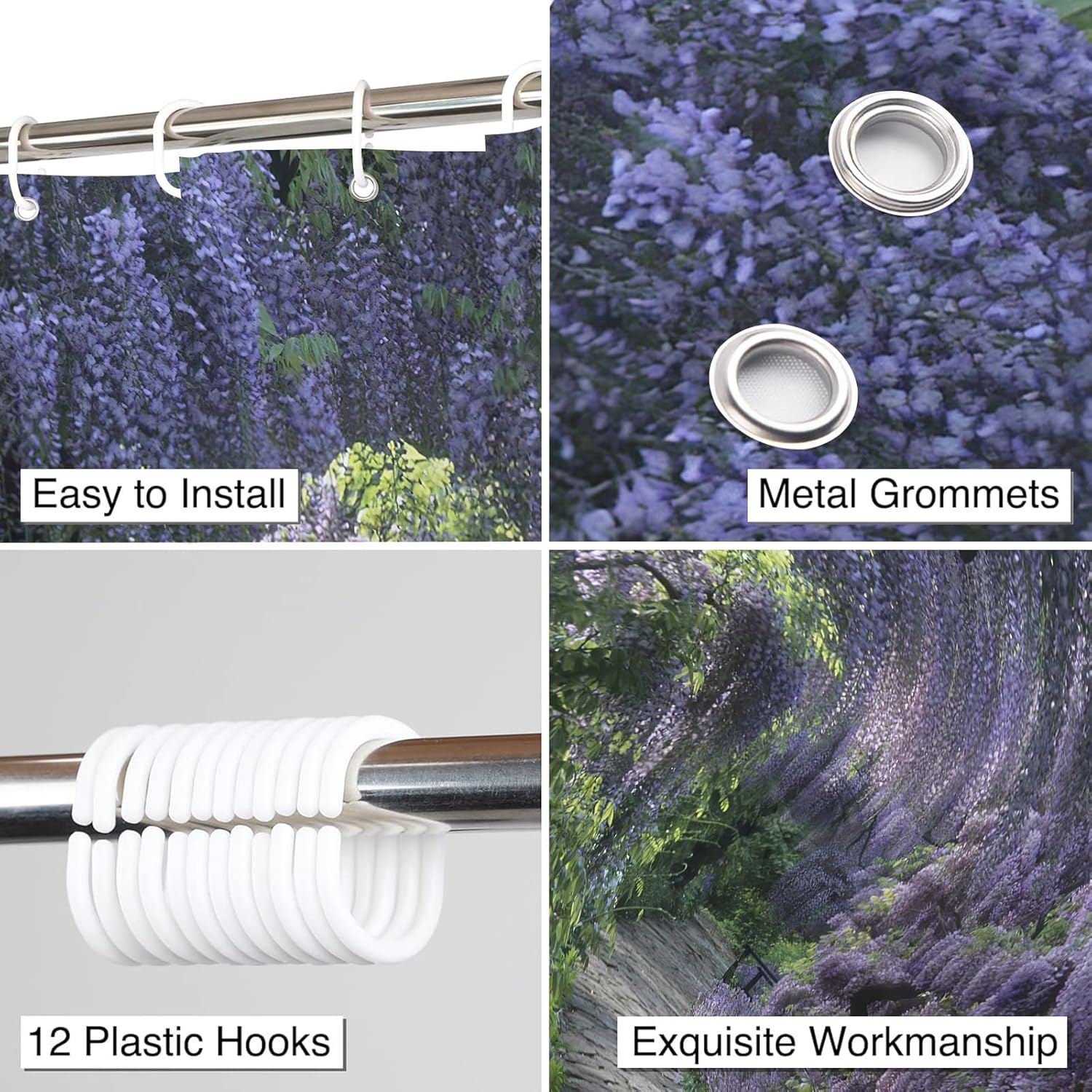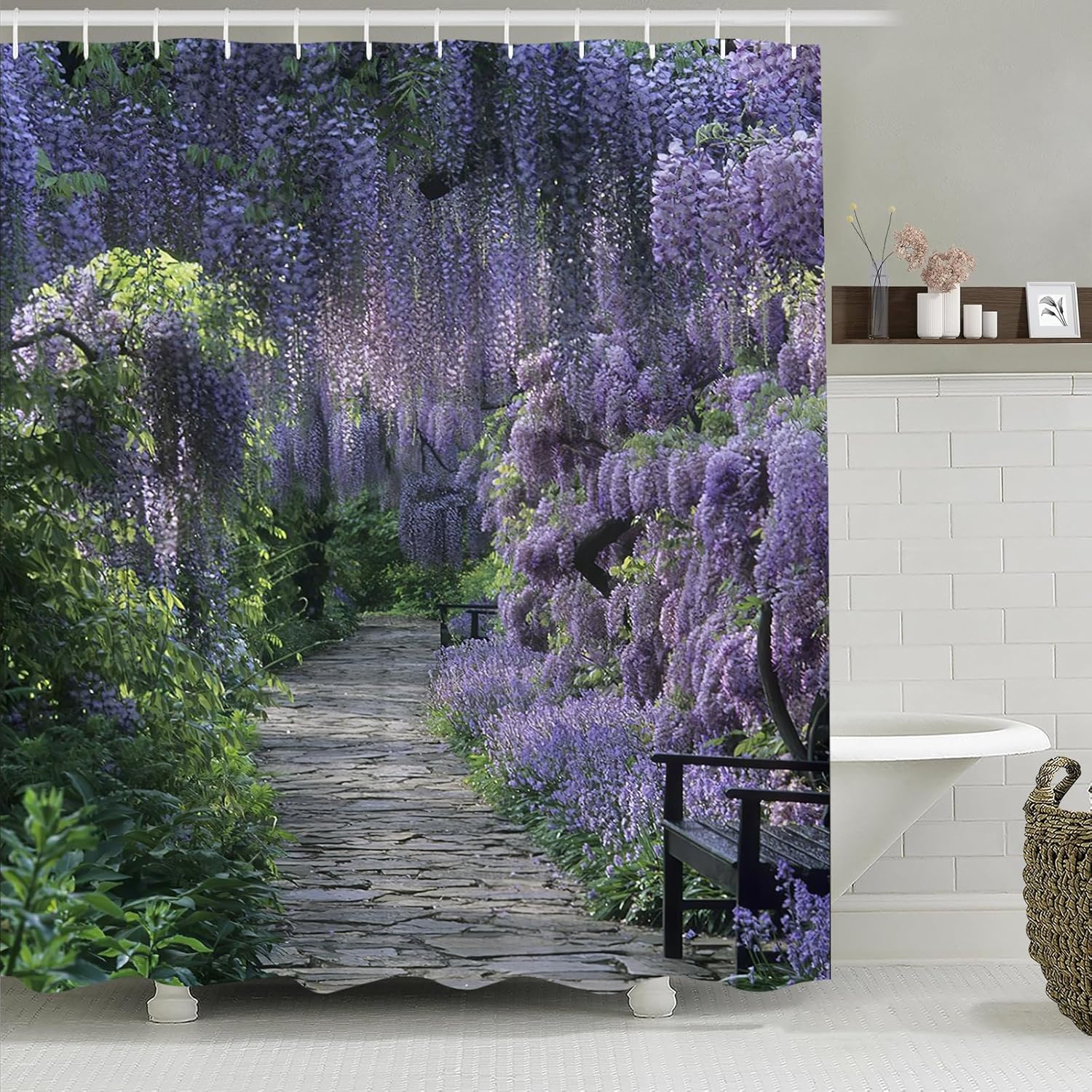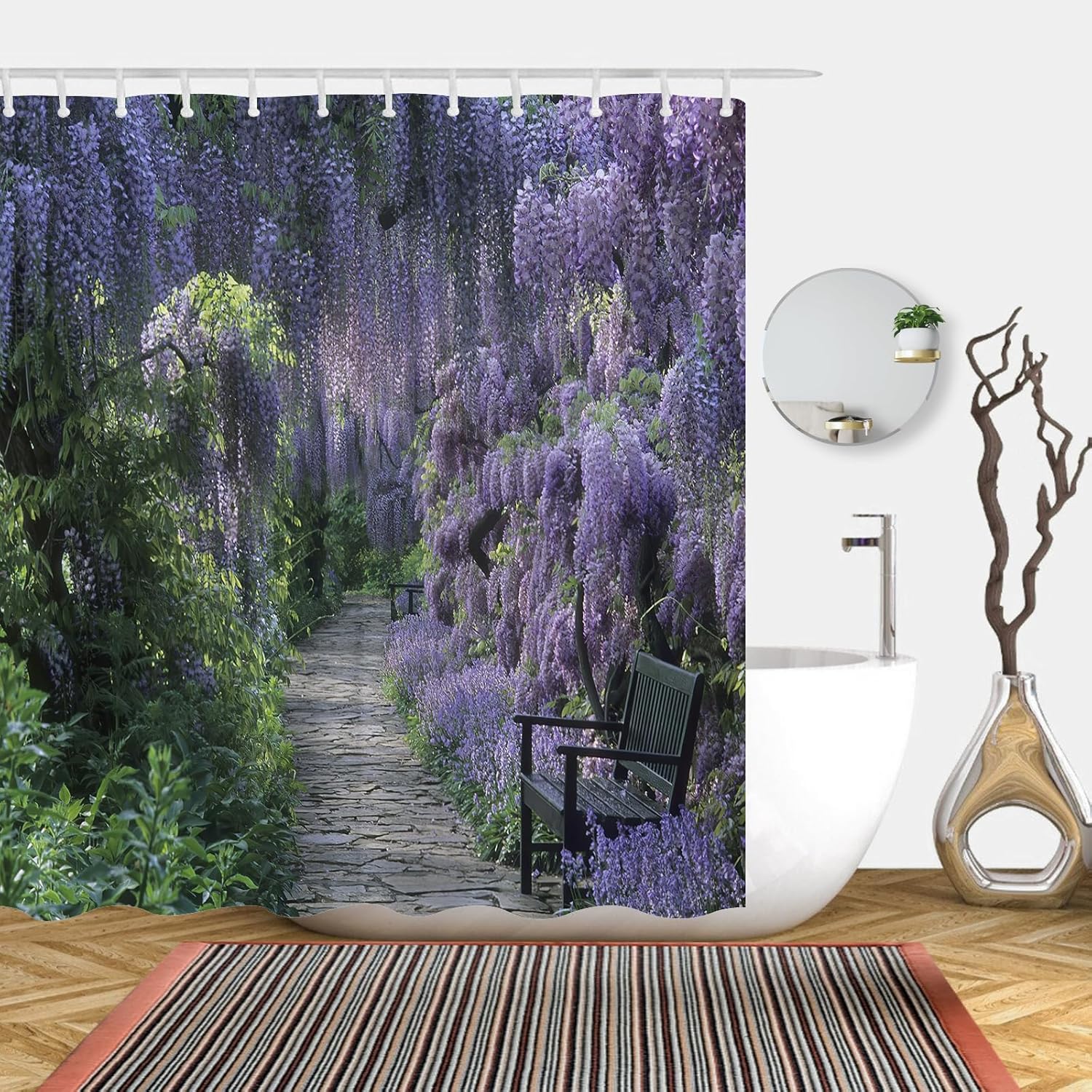 3D Floral Shower Curtain Purple Garden Scenery Bathroom Wet Room Outdoor Long Bath Curtains Mould Proof Resistant Washable Drop Waterproof Fabric with Hooks 180x180cm