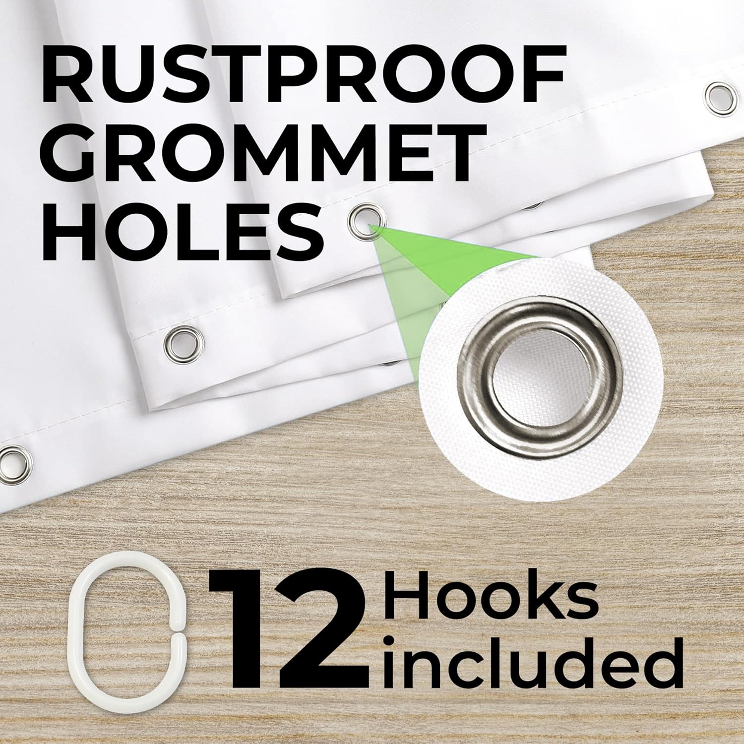 - EASY INSTALLTION – The bath curtain comes with 12 plastic hooks that you can easily put on the 12 rust-proof grommet holes of the curtain. Super easy and you can do it without any additional tools.