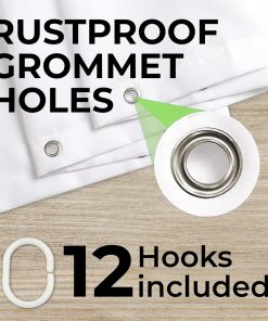 - EASY INSTALLTION – The bath curtain comes with 12 plastic hooks that you can easily put on the 12 rust-proof grommet holes of the curtain. Super easy and you can do it without any additional tools.