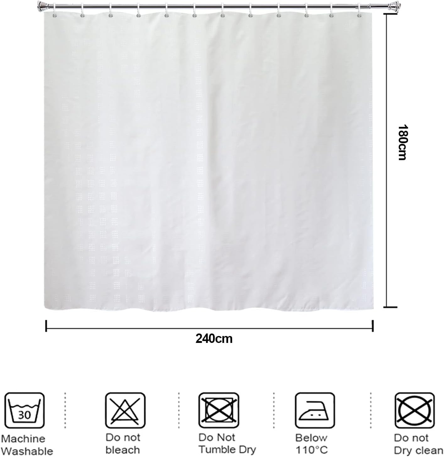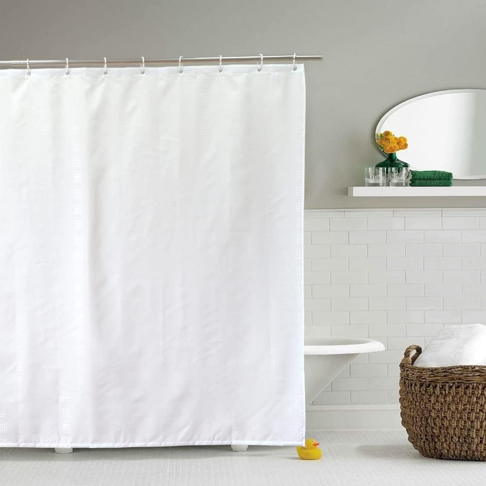 - Package Include: 1pc of extra wide shower curtain, 94.5″W x71″L /240x180cm and 12 white plastic hooks. Shower curtain rod NOT included