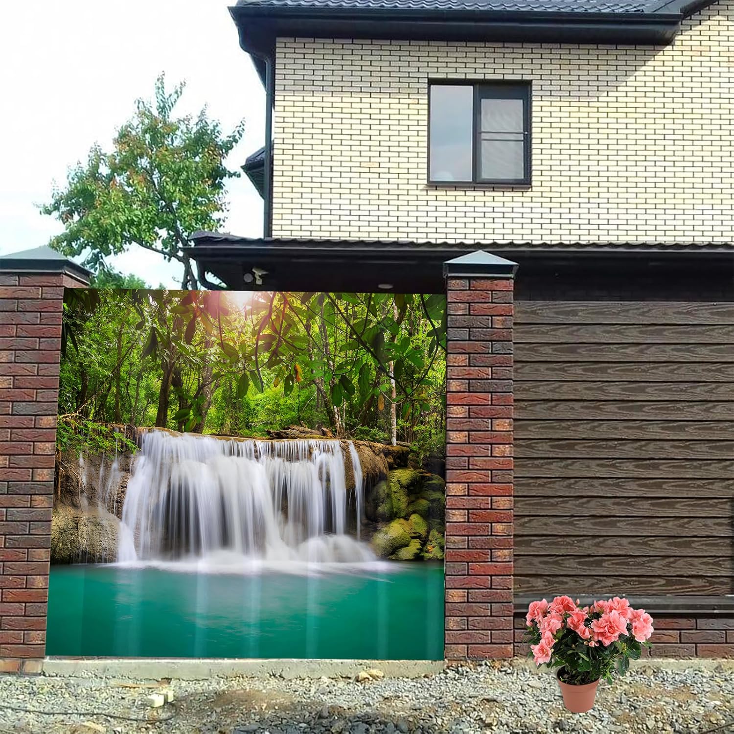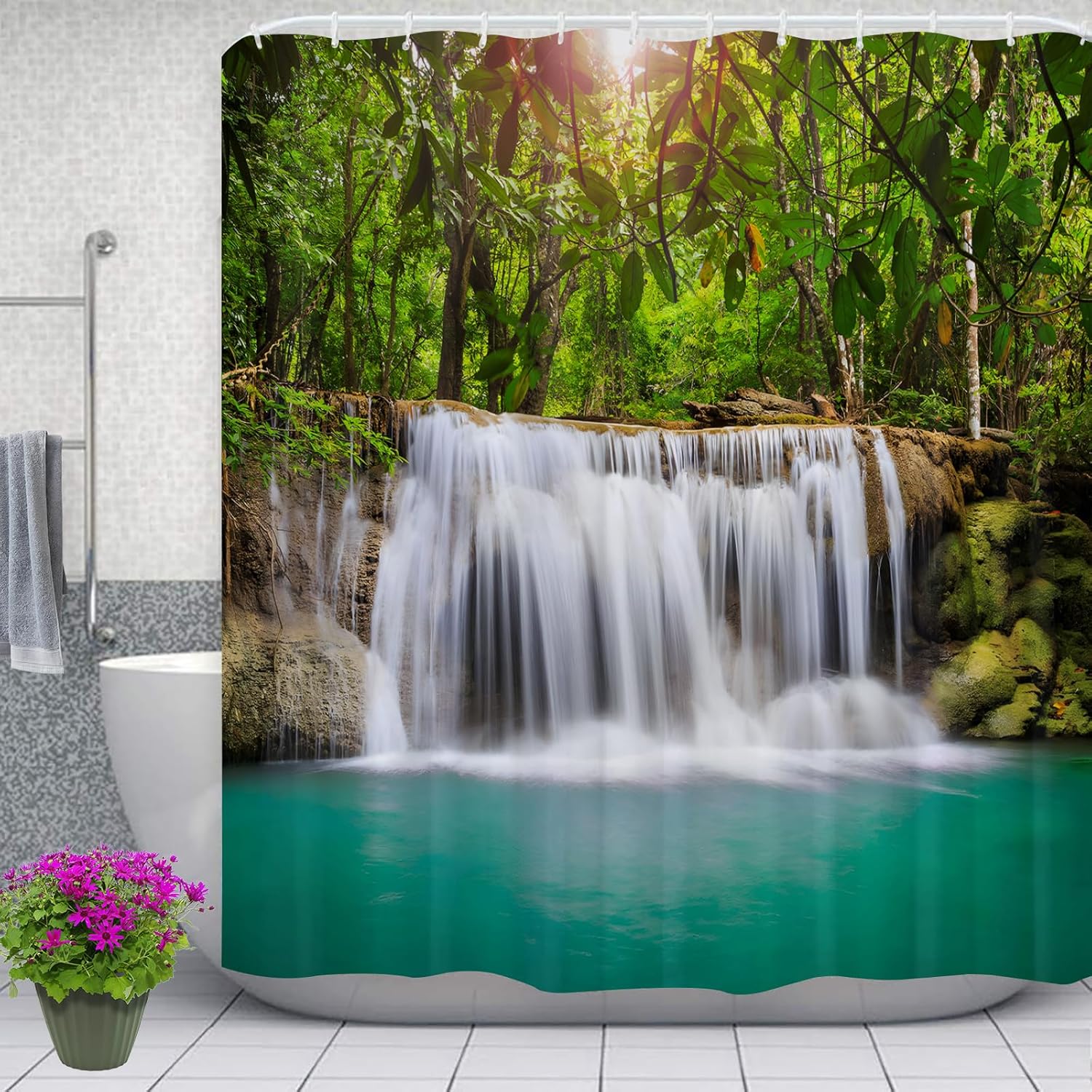 Green Lake Garden Shower Curtain, Summer Waterfall in Forest Woodland Nature Jungle Scenery Art Printing Bath Curtain, Waterproof Polyester Fabric Bathroom Shower Curtain with 12 Hooks, 180x180cm
