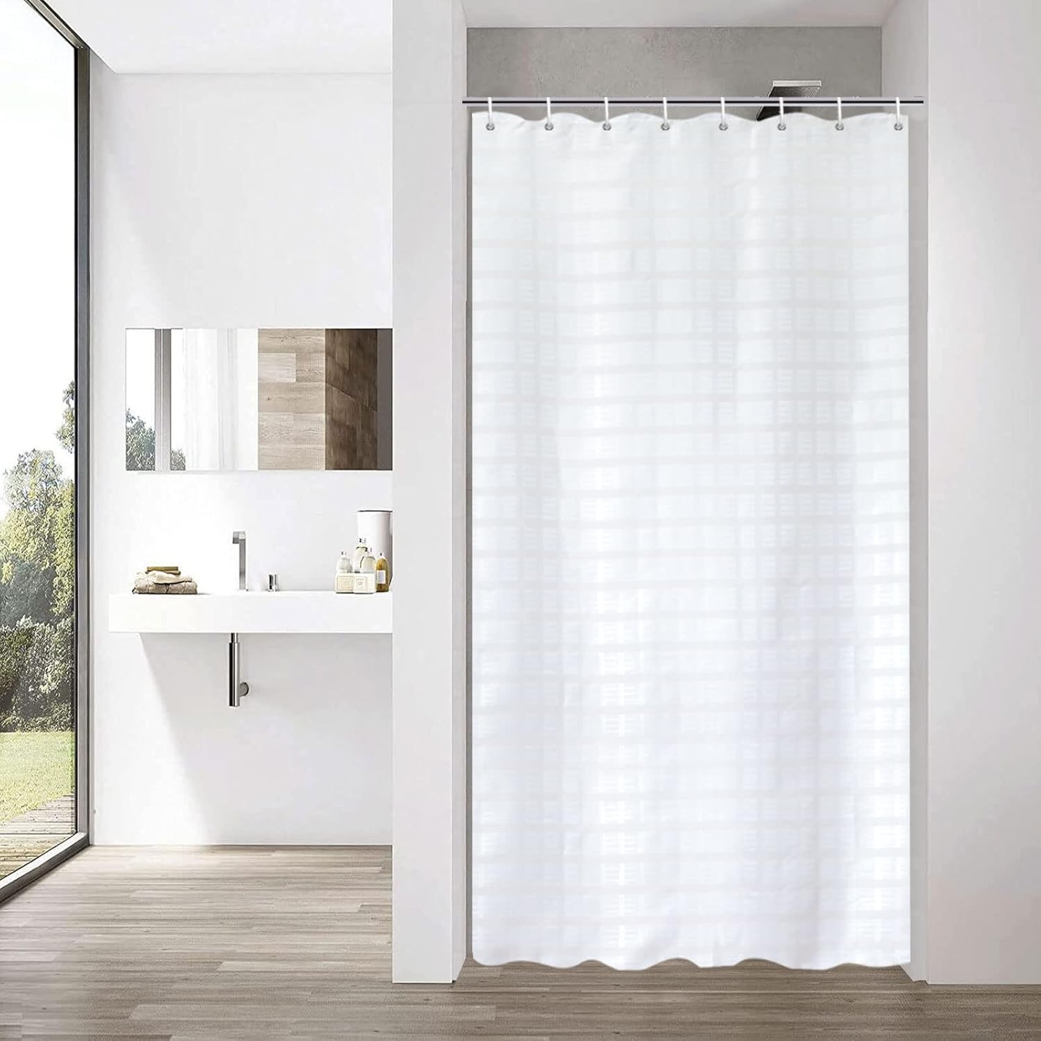 - Package Include: 1pc of white jacquard shower curtain, 35″W x79″L /90 x 200cm and 8 white plastic hooks. Shower curtain rod NOT included