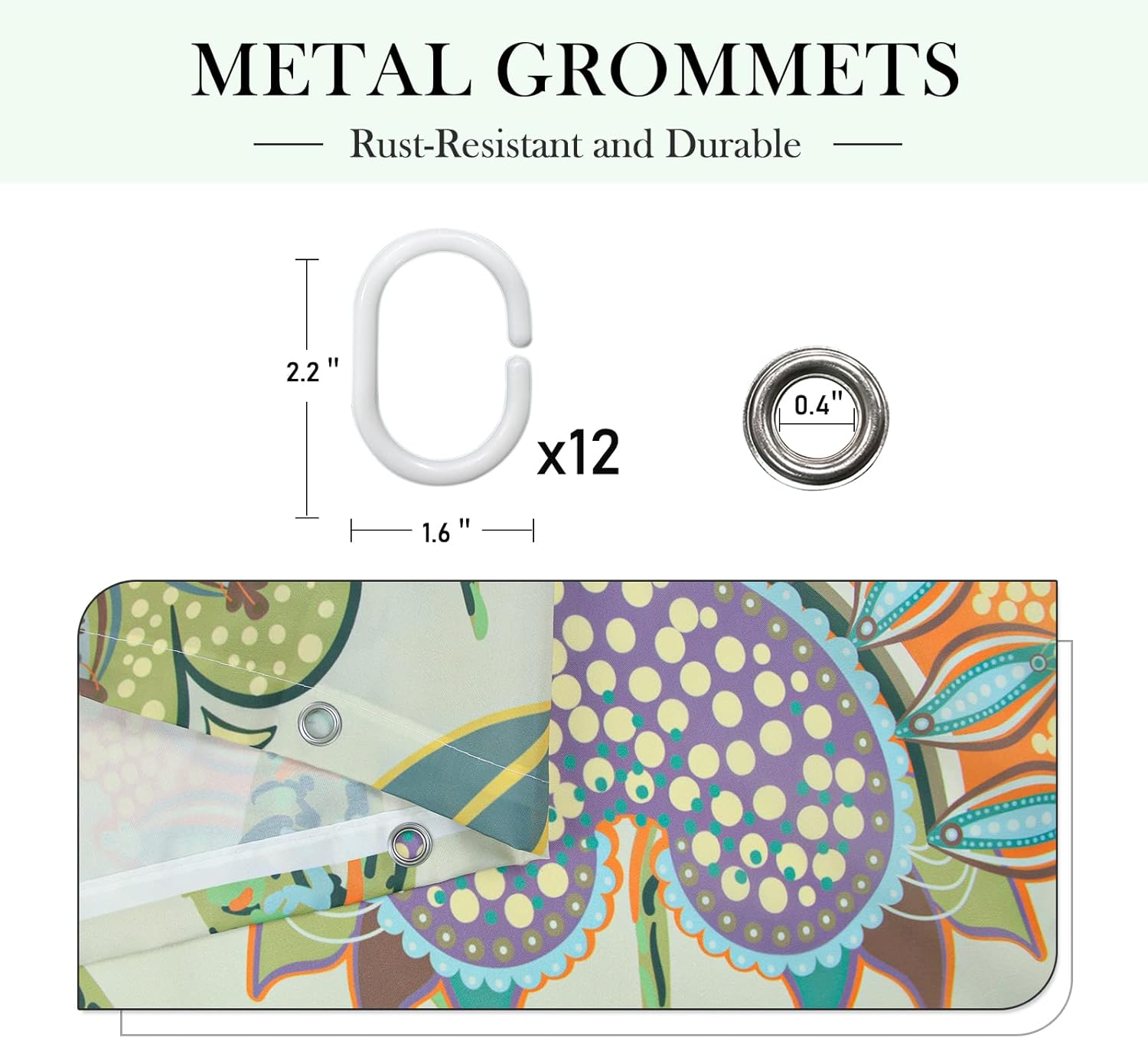 - [Easy to Install & Clean]: Shower curtain set equipped with 12 strong and durable hook Rings for perfectly support the heavy shower curtain. The rust-resistant metal grommets can help you to open and close the shower curtain smoothly. Only takes a few minutes to install and disassemble. Machine washable in cold water, hang to dry, do not bleach. Polyester fabric and special dyeing technology can prevent the deformation and fading after washing.