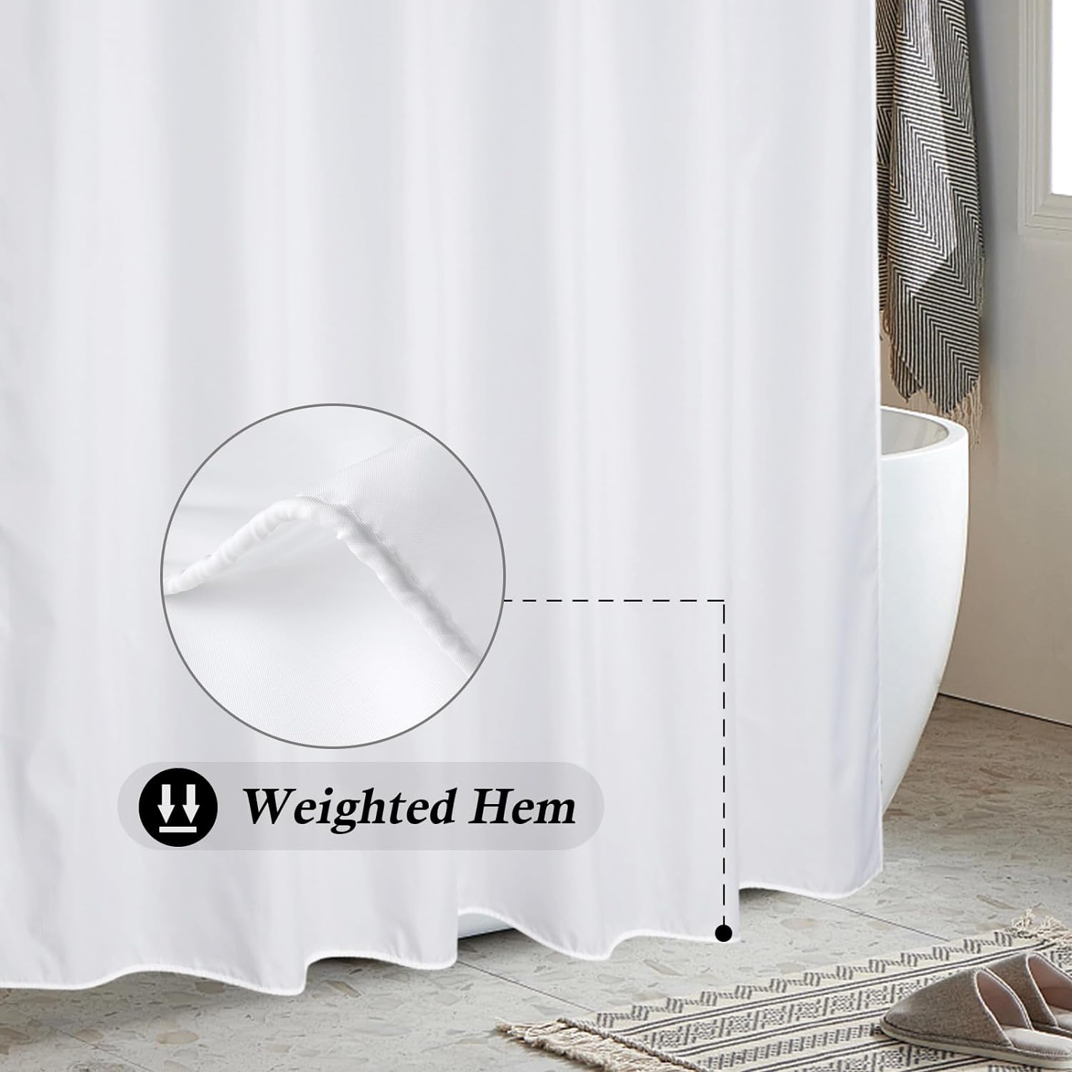 - ▲Weighted Hem: Weighted line Sewn into the bottom of shower curtain to keep it in place. Don’t stick to the body.
