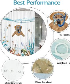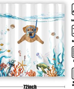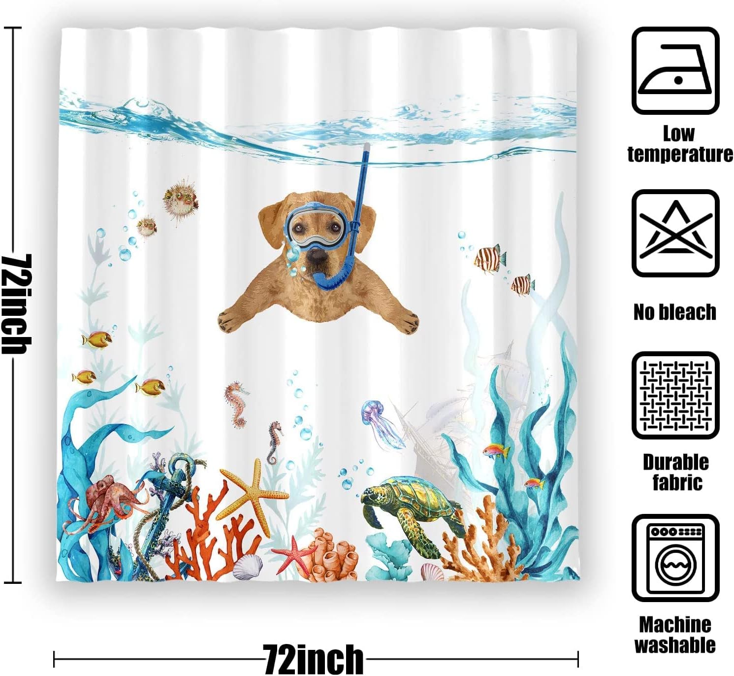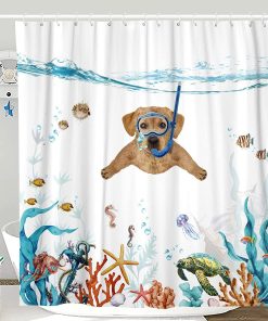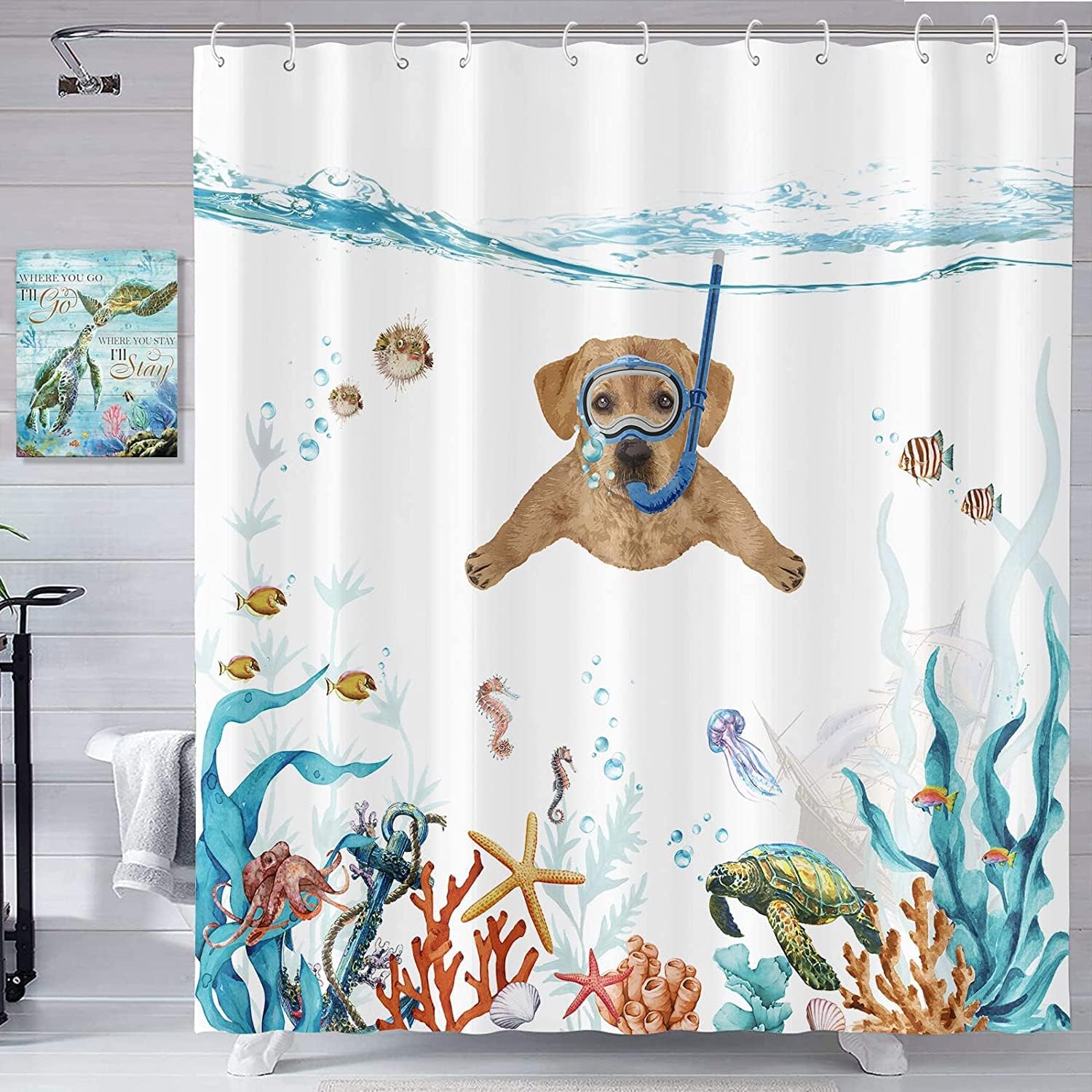 - VIVID & INTERESTING: The shower curtain set is depicted a 3D HD funny dog pattern that has been diving on sea ocean, which is very eye catching to bring your bath shower more fun and the joyful laughter of your child to enjoy shower. Like swimming in the ocean world