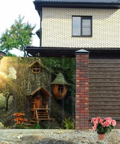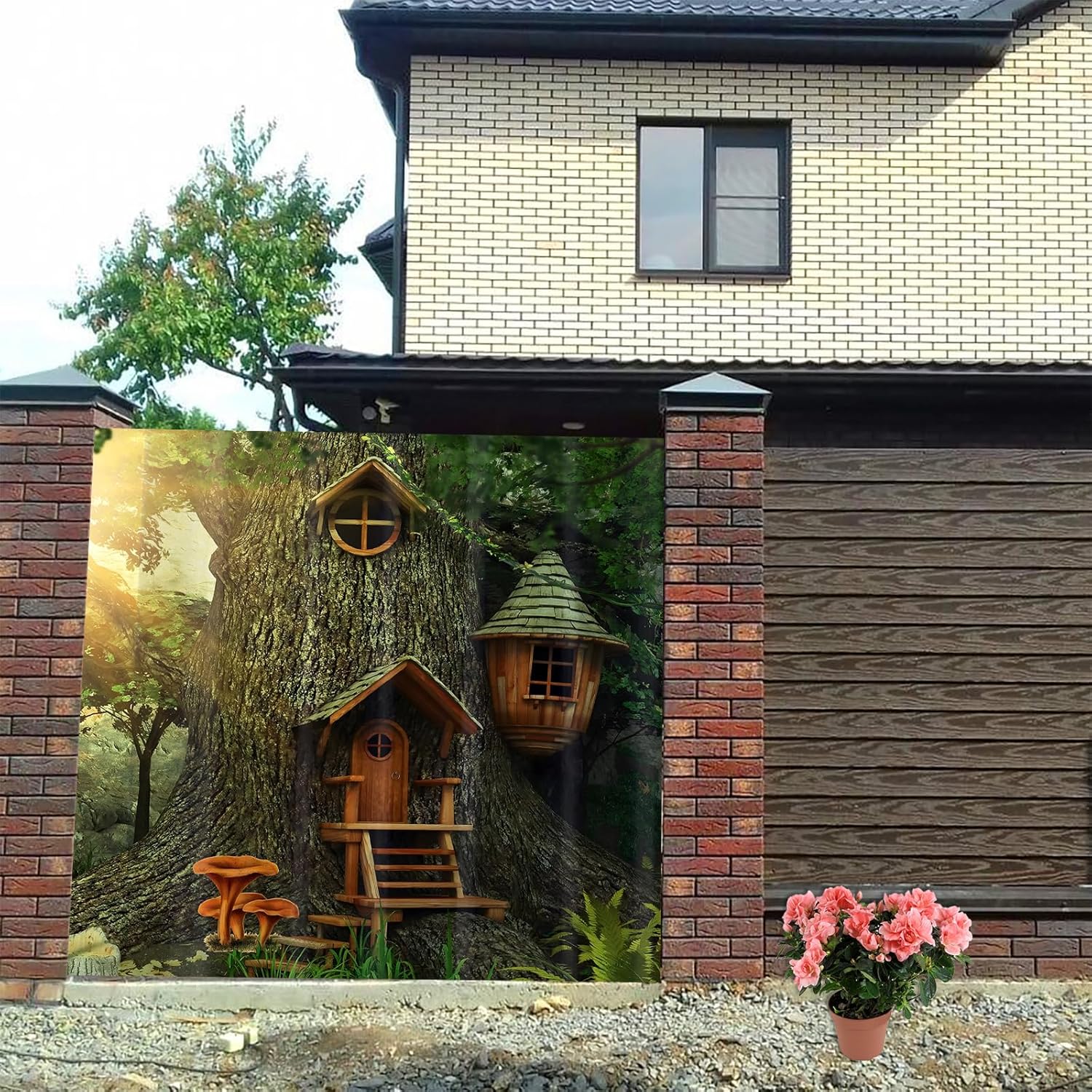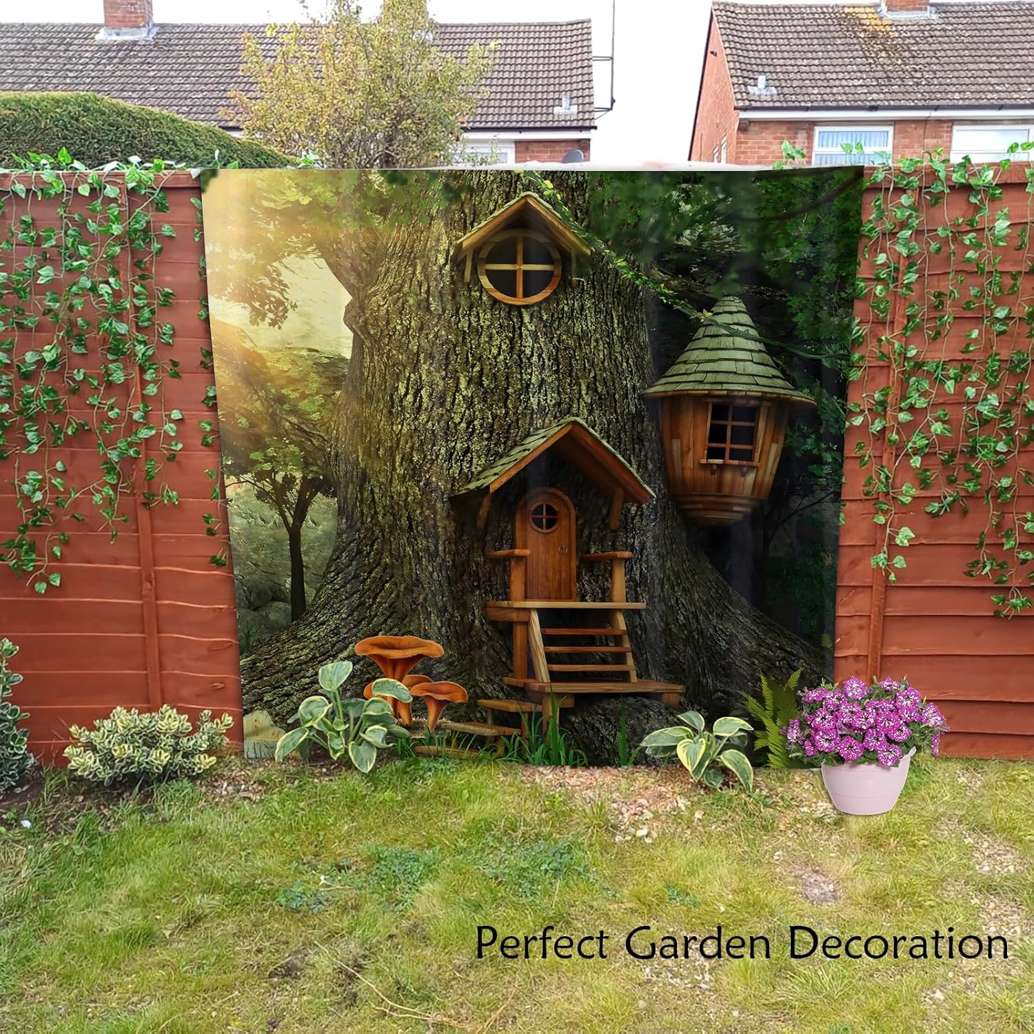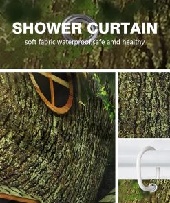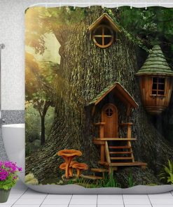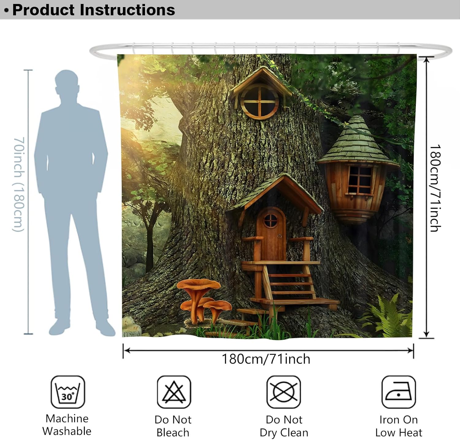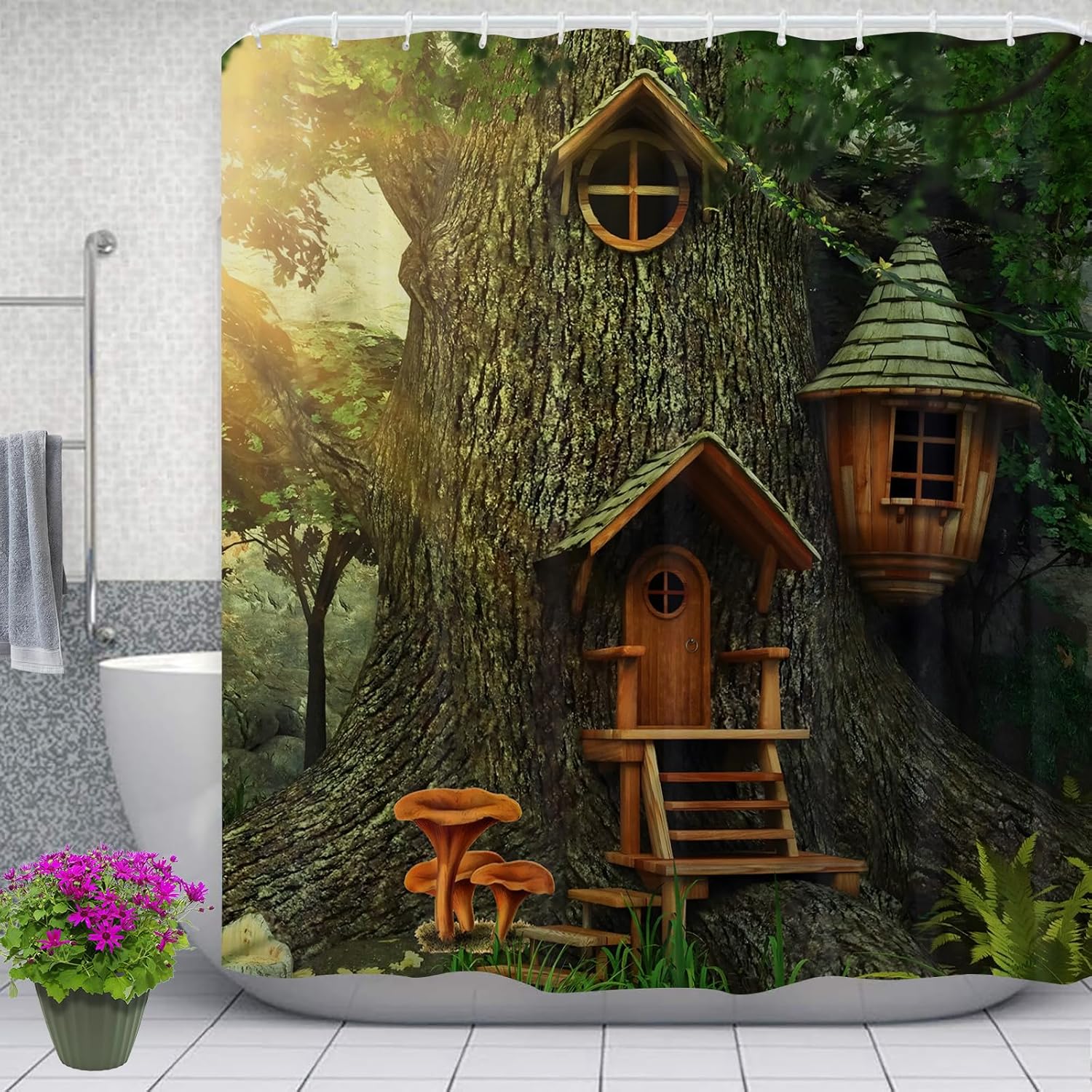 Woodland Outdoor Garden Shower Curtain, Tree House Decor Bathroom Shower Curtain, Kids Fantasy Cartoon Art Waterproof Shower Curtain with 12 Hooks, 180x180cm